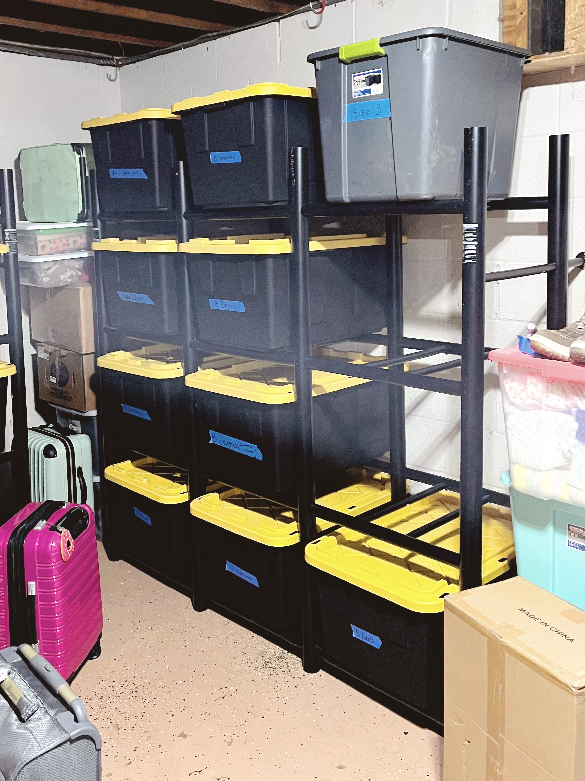 we’ve crammed 3800 sq ft of home into like 1800 sq ft (on a good day…lol) so all storage is in the basement. it’s like an estate sale down there. costumes, clothes, furniture, the guest bed, extra playroom stuff, i mean the list goes on and on and on…
